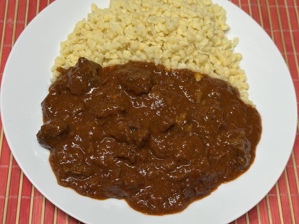 - Hovězí maso – často z kližky, krku nebo jiných prorostlých částí, které se při dlouhém dušení rozvaří do měkka.