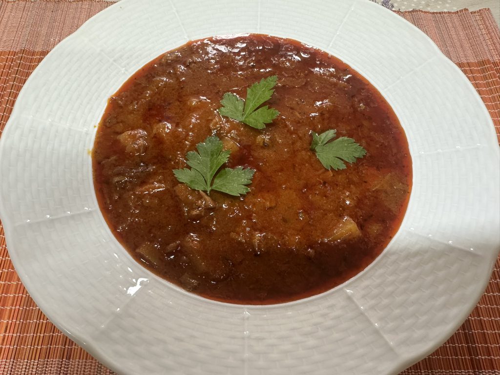 Přidej sušenou chilli papričku, přikryj pokličkou a nech pomalu dusit na mírném ohni asi 2 hodiny, dokud maso nezměkne a omáčka nezhoustne. Já to peču v troubě na 160 °C asi 2–3 hodiny. - Dokončení: