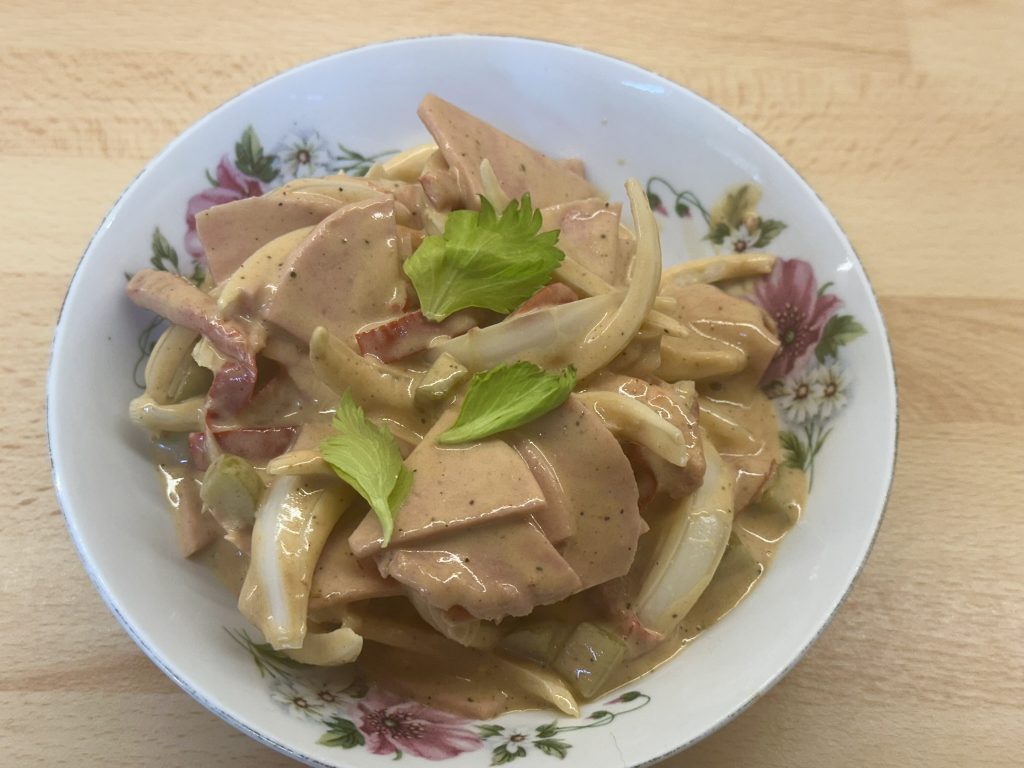 - Smíchej salát: Do mísy dej salám, cibuli, kapii a okurky. Přidej majonézu a vychladlý nálev. Důkladně promíchej.
