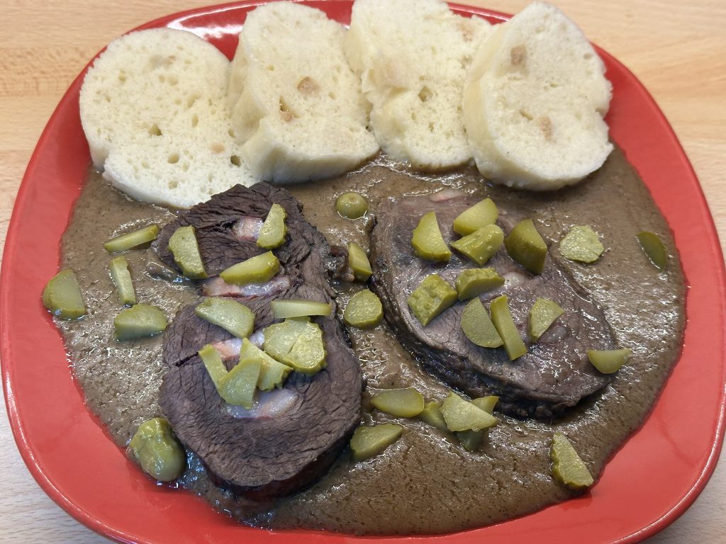 - Pečení v troubě: Peč na 160 °C cca 2–3 hodiny, dokud nebude maso měkké. Občas maso otoč a podle potřeby dolij vývar (není to polévka – má to být jen podlité).