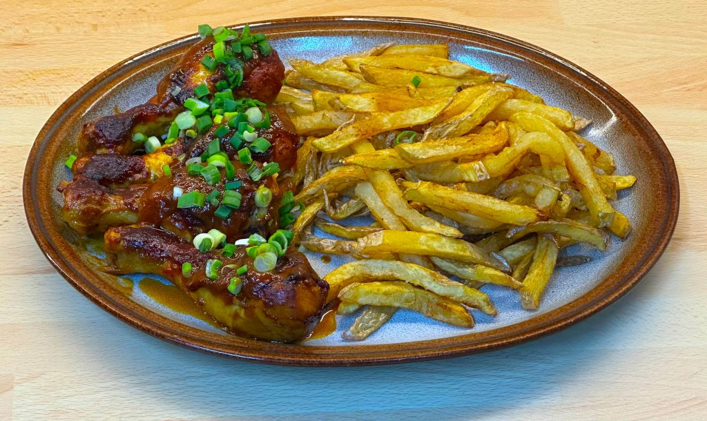 Pikantní kuřecí paličky pečené ve výrazné omáčce, z pálivé omáčky, rajčatového protlaku, sójové a worcesterské omáčky. Nejlépe chutnají s hranolky, bagetou nebo americkými bramborami. V tomto případě s hranolky, ale přikládám i postup na americké brambory.
