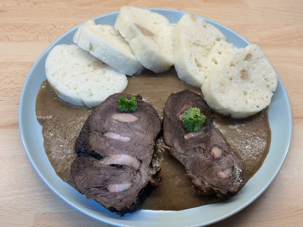- 600 g hovězího masa, zadní (pečeně), falešná svíčková