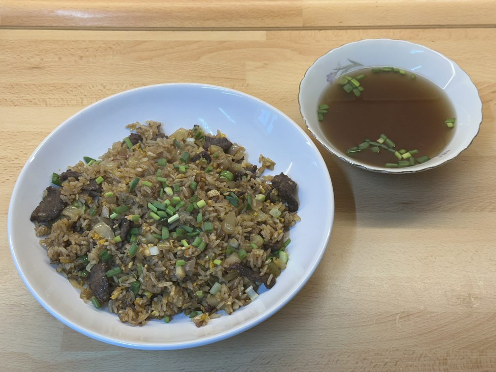 Pro cơm rang dưa bò se podle vietnamských receptů používá hlavně den stará rýže, tenké plátky hovězího a kyselá nakládaná hořčice. Existují i verze s dalšími přísadami, ale tohle je autentický a jednoduchý základ. Doprovodná miska lehkého vývaru k tomuto jídlu odpovídá i popisům z vietnamských zdrojů.